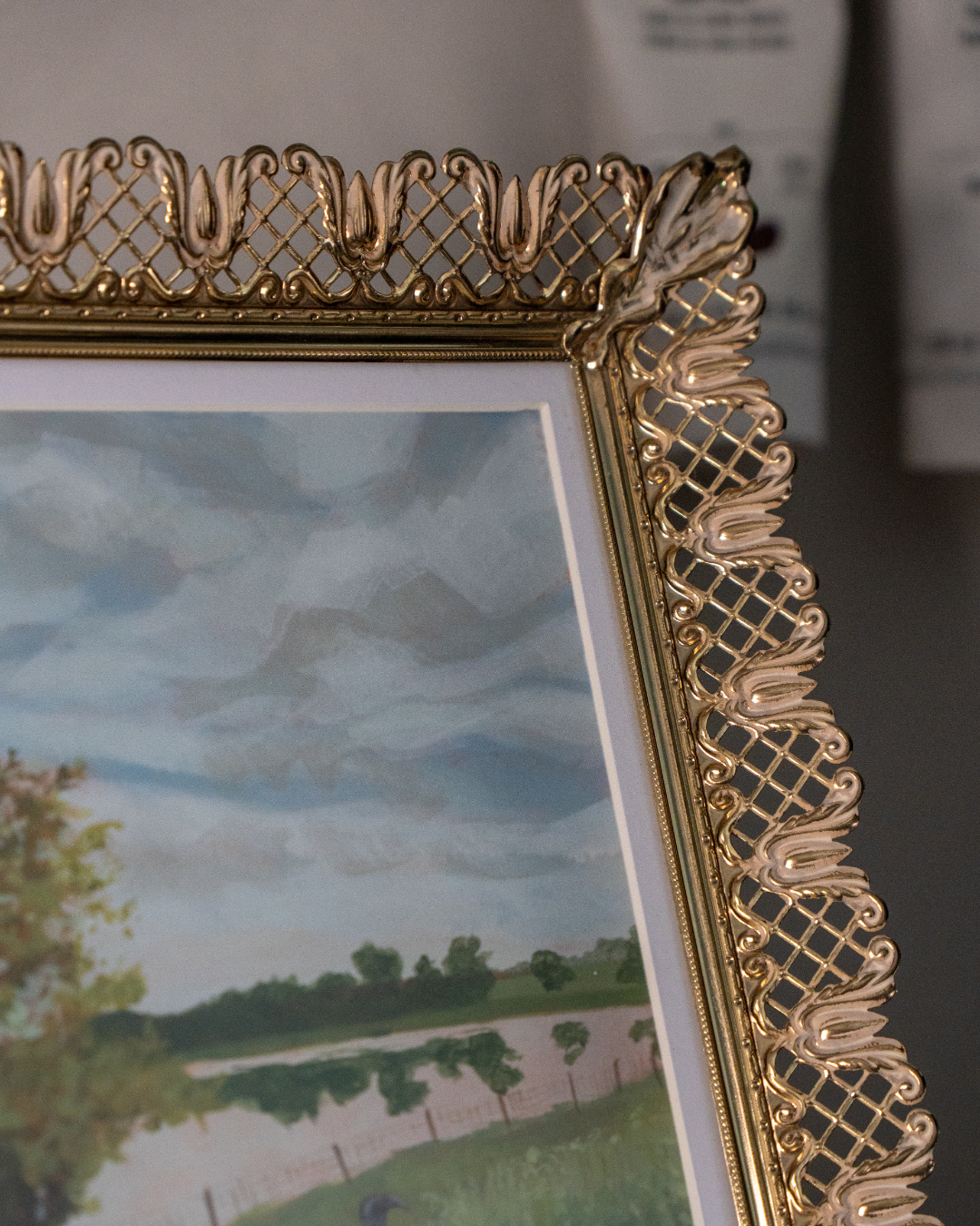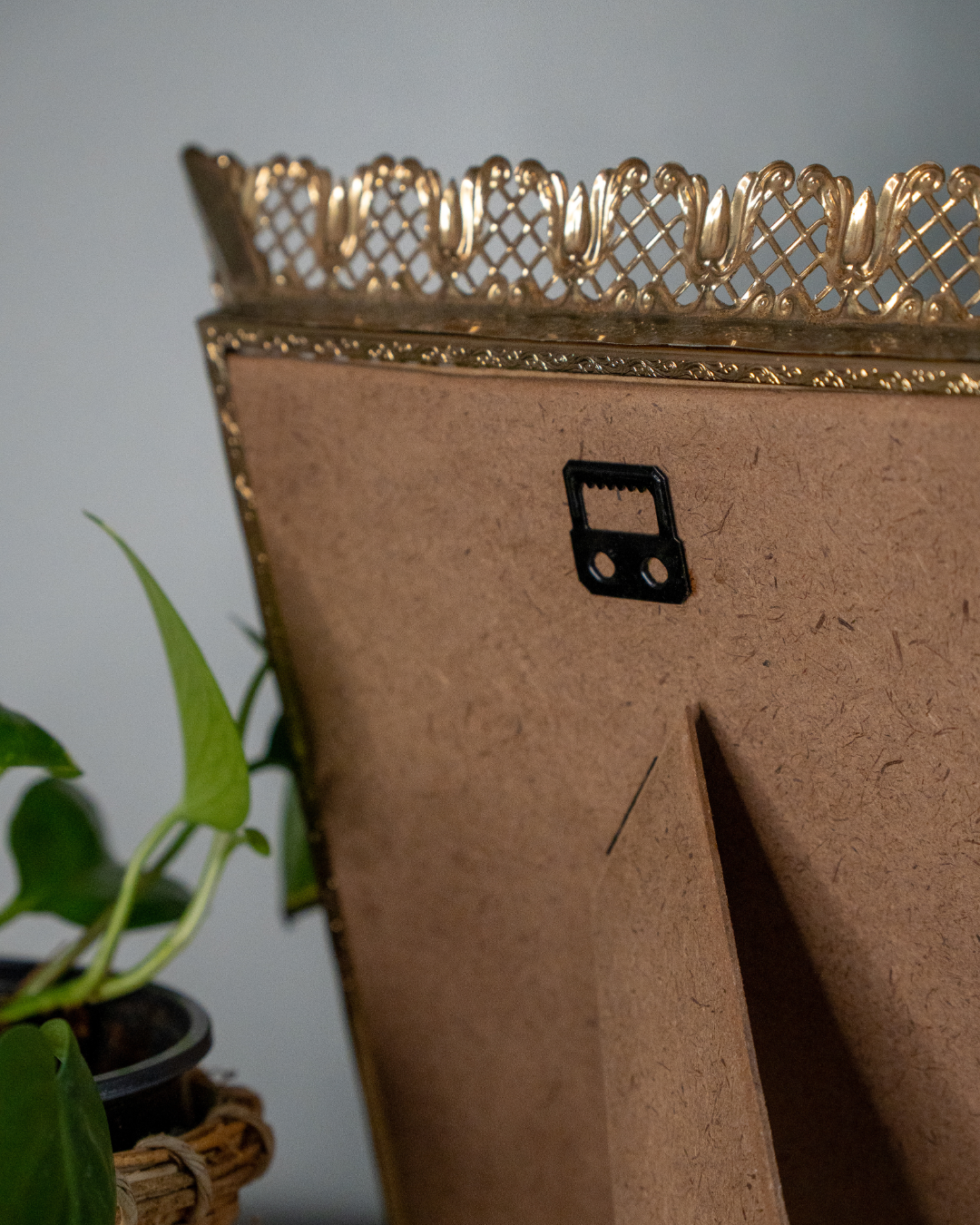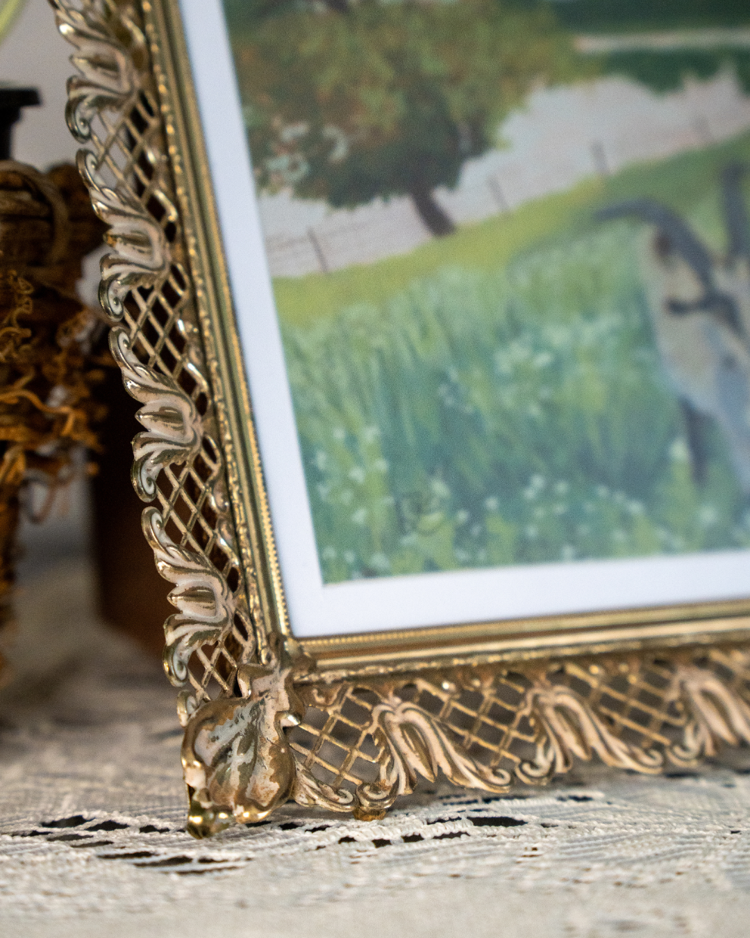 Framing: Ornate vintage gold metal frame with hanging hardware and kickstand (as pictured)