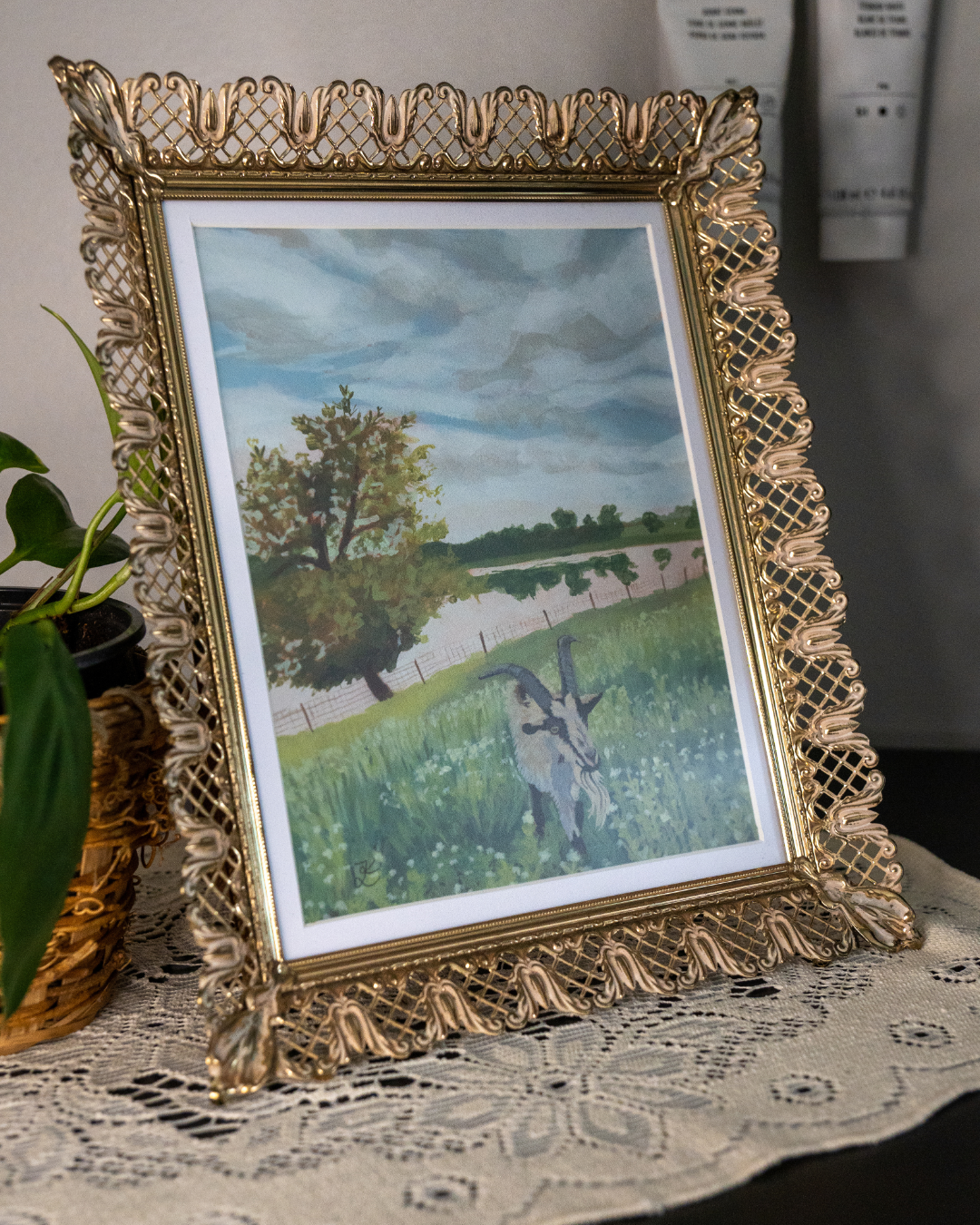 Framed in a thoughtfully chosen vintage gold metal frame with ornate detailing, this artwork arrives ready to hang with sturdy hardware and also includes a built-in kickstand for tabletop display. Whether you hang it on a gallery wall or display it on a shelf, "Zen's Meadow" is a charming, one-of-a-kind piece that celebrates nature, animals, and stillness.