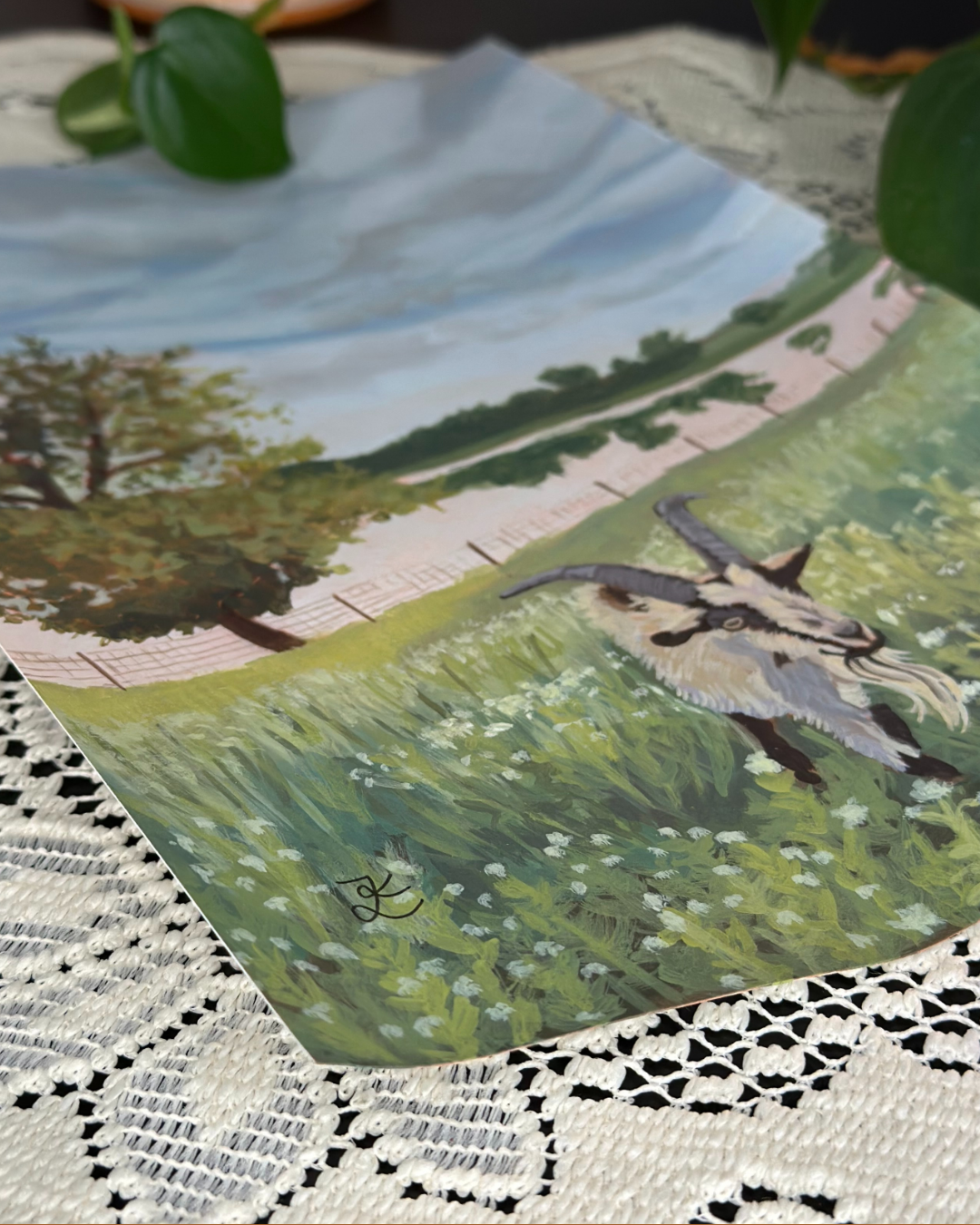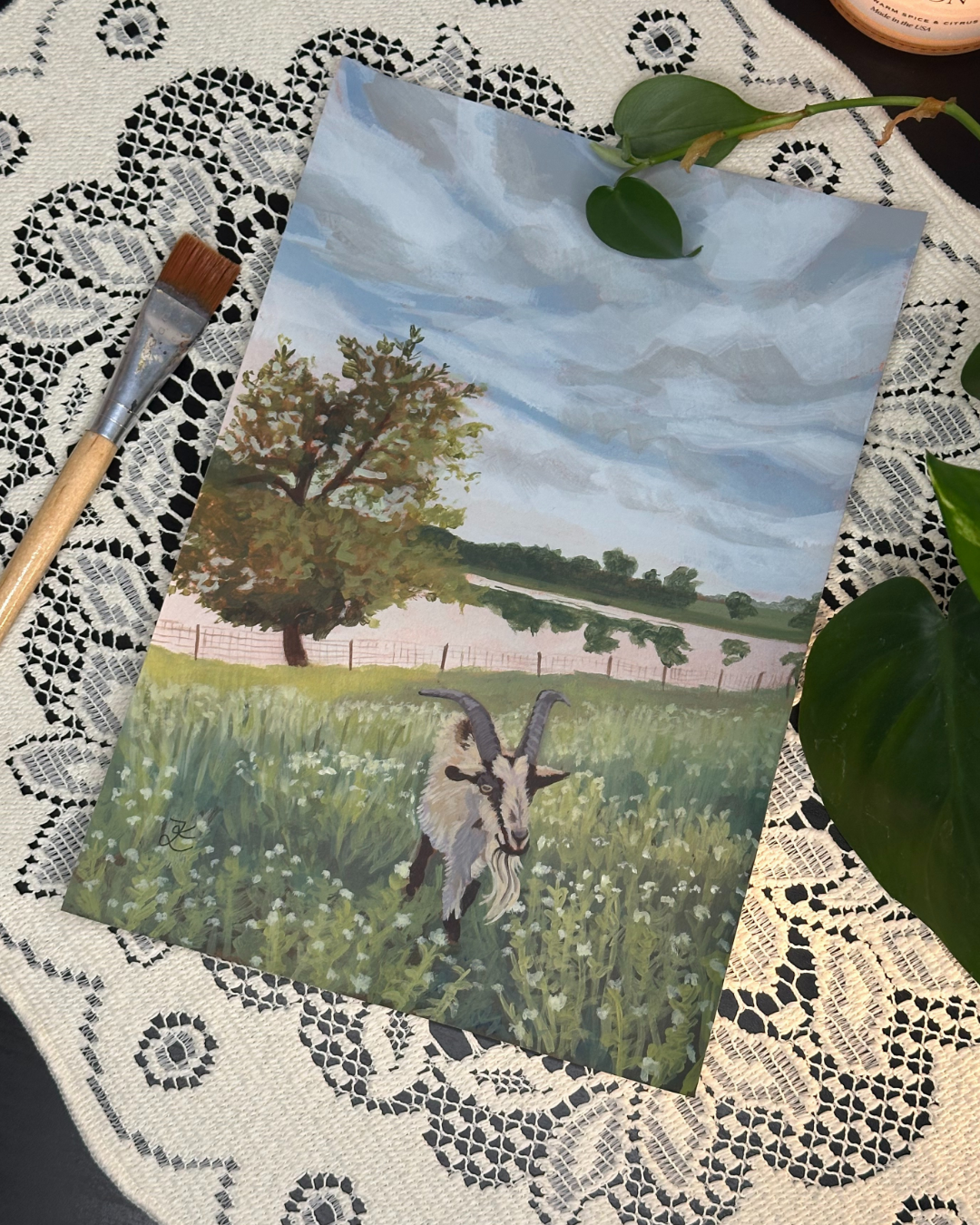 Bring a touch of rustic warmth and charm into your space with "Zen's Meadow", a one-of-a-kind acrylic painting by Minnesota-based artist Kate Livermore. Painted in 2025 on 7×10 inch multimedia paper, this piece features an old white and grey goat named Zen standing peacefully in a field of tall white grassy flowers. A quiet pond and tree in the background complete the scene, capturing the calm beauty of the Minnesota countryside.